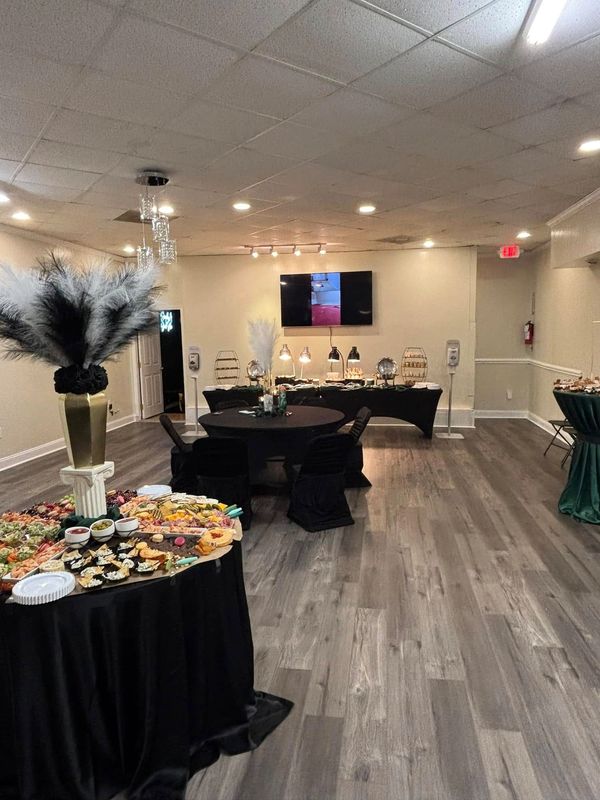NOT PERMITTED: NO Firearms allowed on or in premises. NO Attaching stuff to walls/ceiling/lights.NO Smoke producing devices like candles or sparkles (exception Birthday Candle). NO Water Guns. NO Smoking inside if anyone is found smoking or vaping in the premises a $250.00 fine will be charged. NO cooking devices or grills. NOFireworks.NO Blocking two exit doors clearly marked with EXIT signs. Drapes or Backdrops taller than 10 feet as they are not stable. Excessive use of drapes to create a fire hazard. Glitter or confetti (Extremely painful to clean out of any floor). No Alcohol beverages permitted outside the venue